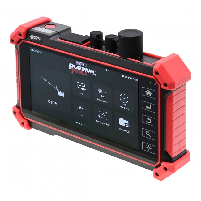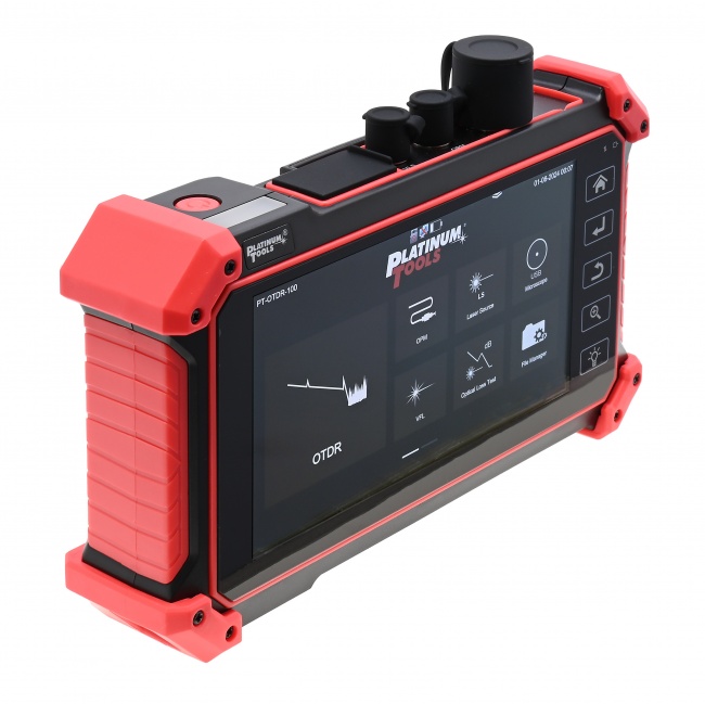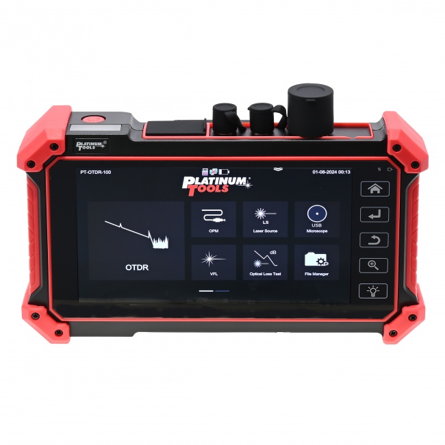 The PT-OTDR-100 mini OTDR tester provides a simple to setup and easy to use solution for OTDR testing. Includes a 5.5 inch OLED touch screen for easy viewing of cable tests and can save and export your OTDR tests. This unit will perform OTDR tests, OPM, VFL and laser source functionality for fiber optic cable, and will also perform continuity testing and TDR for Category cable