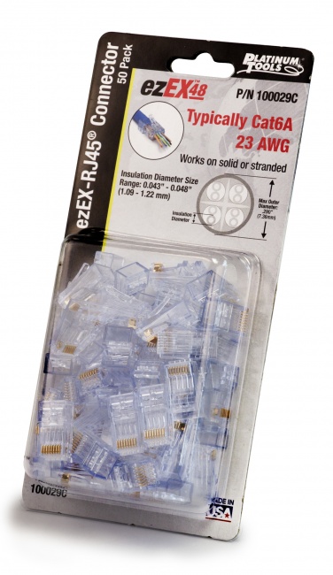 The patented ezEX48 connectors feature a unique integrated Hi-Lo stagger load bar and allows ‘big’ conductors to pass through the front end of the connector making it easy to verify the wiring sequence before terminating. This connector is typically used with Cat6A (Lg. Cat6) cabling and is recommended for PoE/PoE+ and Data applications. The termination tool for these connectors is the EXO Crimp Frame and EXO-EX Die (100061C).