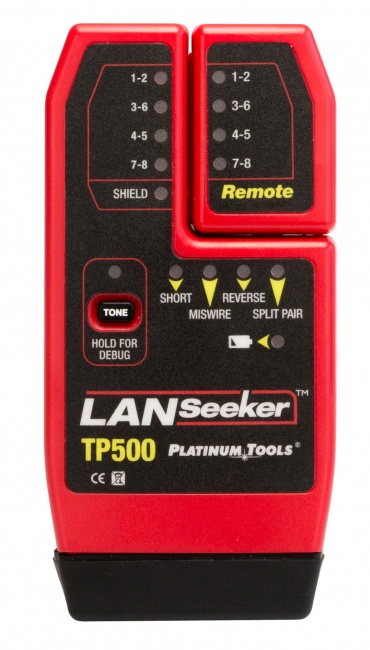 The LANSeeker™ is a fast, rugged cable tester and tone generator in one unit. It displays cable test results using LED indicators on the main and remote unit. An easy-to-use professional grade tool, the LANSeeker is a must have for residential and commercial cable installers. When the unit senses a connection between the main and remote unit, the battery-saving auto-on feature initiates test results within 2 seconds. The tester automatically powers off within 5 seconds of the cable being disconnected. LANSeeker tests for shorts, opens, miswires, reversals, and split pairs and can display connection and fault information on a pair-by-pair basis. It also generates audio tones for use with tone tracers on all pairs.